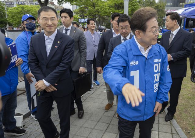 ▲더불어민주당 이재명 대선후보가 16일 전북 익산시 익산역 동부광장에서 열린 유세를 마친 뒤 이날 유세에 참가한 무소속 김상욱 의원과 유세장을 떠나고 있다. ⓒ연합뉴스 |