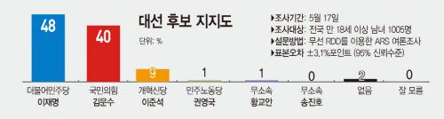 According to a poll conducted by the Korea Public Reputation Research Institute (KOPRA) at the request of Asia Today on May 17, Lee led with 48% support, followed closely by Kim at 40%. This marked Kim’s first time reaching the 40% threshold in KOPRA’s polling. Both candidates gained one percentage point from the previous survey on May 13, keeping the 8-point margin unchanged.