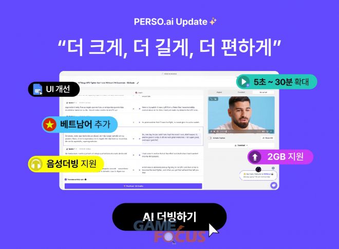 이번 업데이트로 PERSO.ai의 사용자들은 AI 비디오 트랜슬레이터를 활용해 초단편에서 장편까지 다양한 길이의 영상을 더빙할 수 있게 됐다. 기존에 지원했던 규격은 20초에서 20분까지, 1GB의 영상이었는데, 이를 5초에서 30분까지로 늘리고 용량도 두 배인 2GB로 확장한 것이다.
