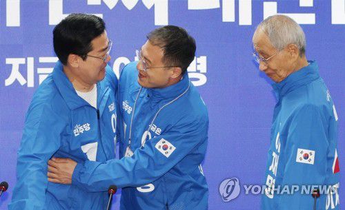 (서울=연합뉴스) 이진욱 기자 = 19일 서울 더불어민주당 여의도 당사에서 열린 중앙선거대책위원회에서 박찬대 대표 직무대행 겸 원내대표와 윤여준 총괄선대위원장이 국민의힘을 탈당한 뒤 민주당에 입당한 김상욱 의원을 환영하고 있다. 2025.5.19