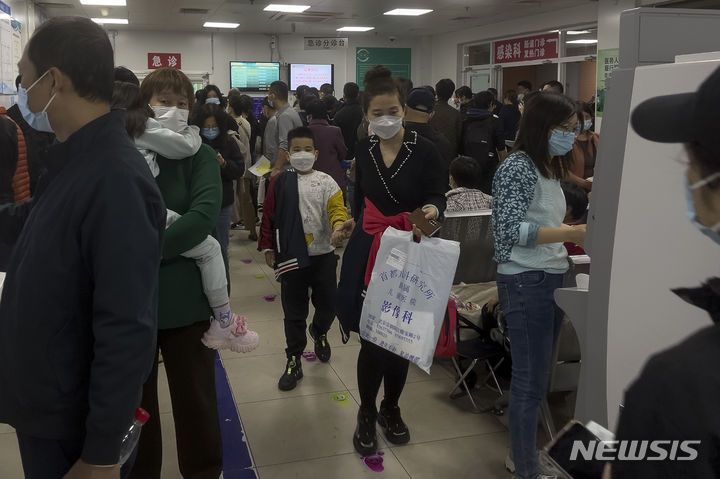 [베이징=AP/뉴시스]??중국 본토에서 코로나19 확산세가 지난달부터 이어지고 있는 가운데, 이달 말 최고 정점에 이를 것이라는 분석이 나왔다. 사진은 2023년 10월 30일 베이징의 한 어린이 병원의 붐비는 입원실에서 차례를 기다리는 아이들과 부모들. 2025.05.19 |