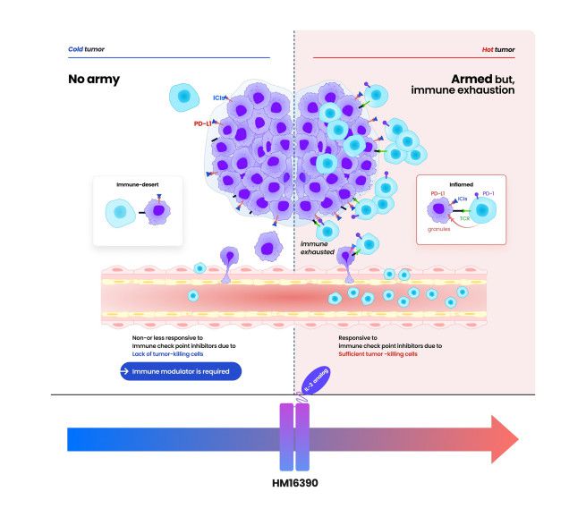 HM16390은 면역세포의 분화와 증식을 조절하는 ‘IL-2’를 차별화된 전략으로 새롭게 디자인한 차세대 IL-2 변이체다. HM16390은 T 세포의 증식 및 활성화를 유도하는 기전으로, 특히 종양미세환경에서 면역관문억제제에 반응하는 종양침윤림프구(Tumor-Infiltrating Lymphocytes·TIL)의 수를 증가시켜 면역원성이 낮은 ‘cold tumor’를 면역원성이 높은 ‘hot tumor’로 전환, 항종양 효과를 극대화하도록 설계됐다.