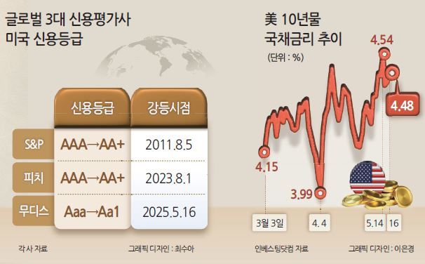 ▶투자자들 긴장감 여전…국채금리 급등, 달러화·증시 하락 이어질 수도=트럼프 행정부가 미국 신용등급 강등과 관련 진화에 나섰지만 미 국채금리 급등과 장단기 금리차 악순환, 달러화 약세, 주가 하락으로 이어질 수 있다는 우려도 나온다.