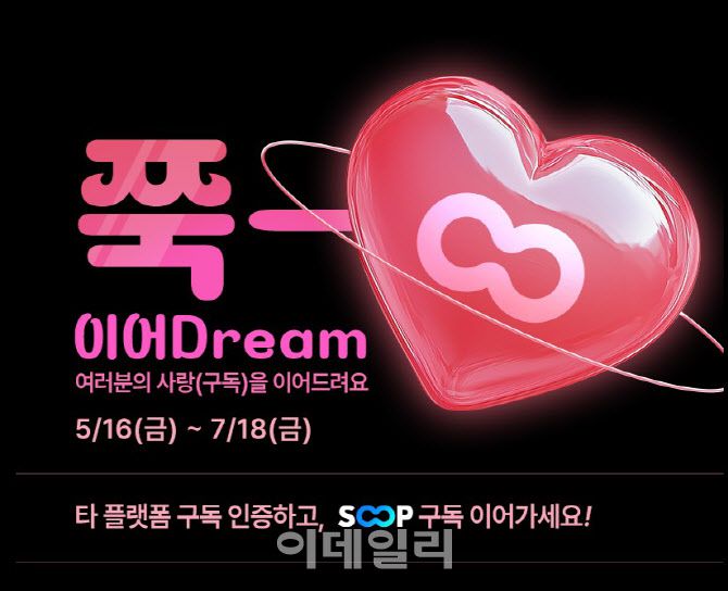 [이데일리 김아름 기자] SOOP(067160)이 플랫폼 간 구독자 연결을 지원하는 ‘쭉~ 이어Dream’ 이벤트를 오는 7월 18일 까지 두 달간 운영한다고 19일 밝혔다.