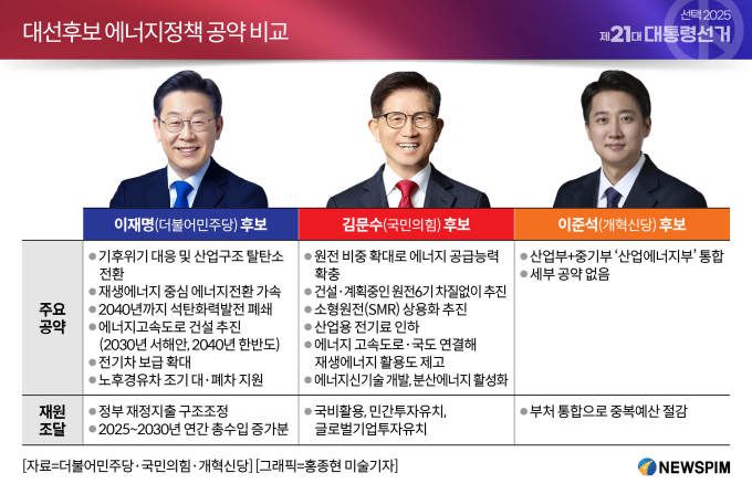 이재명 더불어민주당 후보는 '원전 유지, 신재생에너지 확대'를 내세우고 있다. 반면 김문수 국민의힘 후보는 '원전비중 확대'를 제시하고 있다.