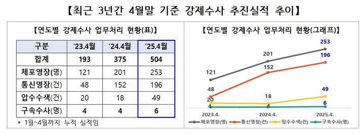 [서울=뉴시스] 고용노동부의 최근 3년간 4월말 기준 강제수사 추진실적 추이. 2025.05.19. (자료=고용노동부 제공) *재판매 및 DB 금지 |