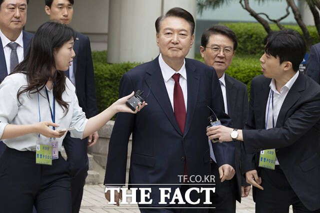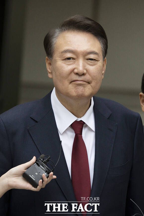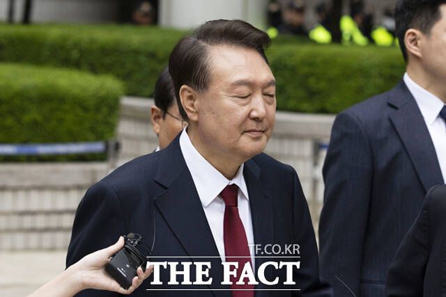 국민의힘 탈당 후 첫 공개 출석...'미소 띤' 윤석열 [TF사진관]