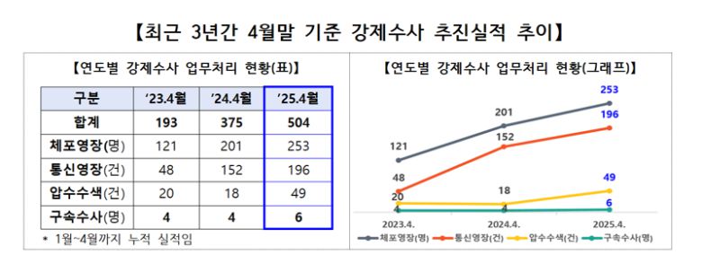 19일 고용노동부에 따르면, 올해 4월 기준 구속수사, 체포영장 집행 등 강제수사 실적은 504건으로 집계됐다. 지난해 같은 시기에 비해 34.4% 증가한 수준이며, 2023년과 비교하면 2.6배나 늘어난 수치다.