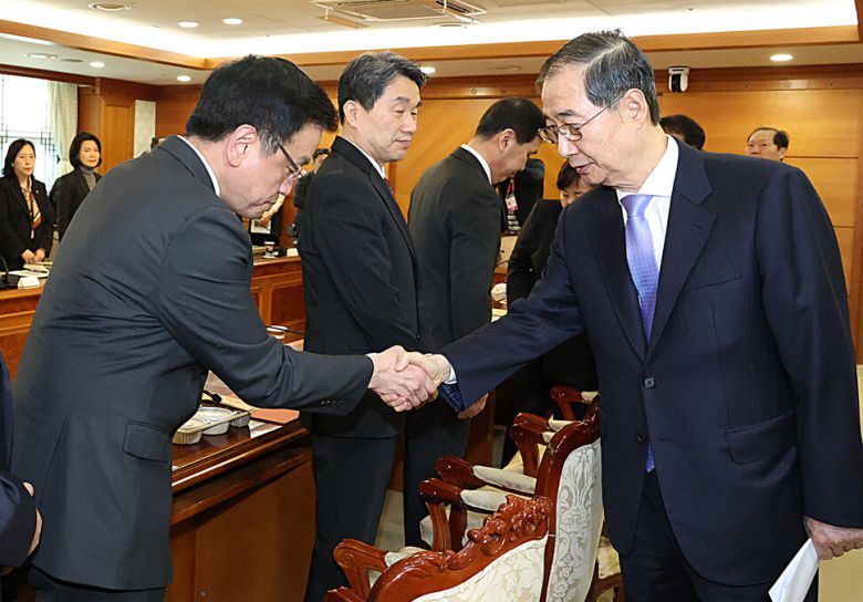 2025년 3월24일 헌법재판소의 탄핵 기각 결정에 따라 대통령 권한대행으로 복귀한 한덕수 국무총리가 서울 종로구 정부서울청사에서 열린 국무위원 간담회에 참석해 직전까지 대통령 권한대행을 맡았던 최상목 경제부총리와 악수하고 있다. 두 사람은 모두 기재부 출신이다. 대통령실 사진기자단