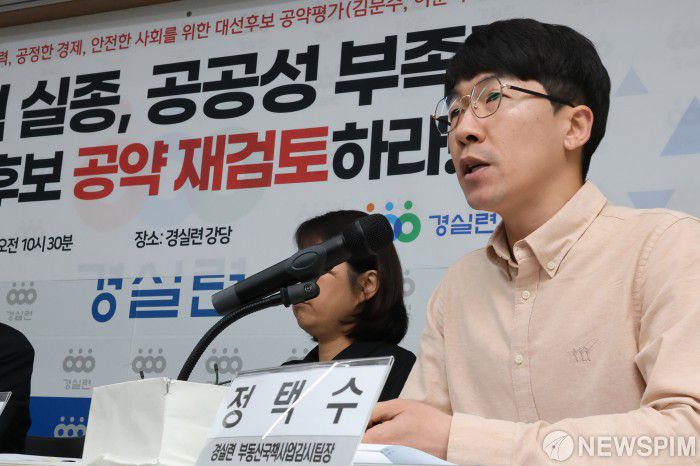 [서울=뉴스핌] 양윤모 기자 = 21대 대선 김문수 국민의힘 후보와 이준석 개혁신당 후보의 공약 중간점검 발표 기자회견이 19일 오전 서울 종로구 경실련 강당에서 열렸다.이자리에는 서휘원 경실련 정치입법팀장,권오인 경실련 경제정책팀장,김성달 경실련 사무총장,임효창 경실련 상임집행위원장,남은경 경실련 사회정책팀장,정택수 경실련 부동산국책사업감시팀장이 참석했다. 2025.05.19 yym58@newspim.com