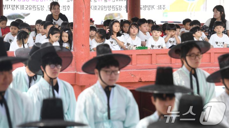 (서울=뉴스1) = 19일 경남 거창군 거창읍 거창향고 명륜당 앞뜰에서 성년의 날을 맞아 올해 만19세로 성년이 되는 경남도립거창대학, 한국승강기대학교 학생 50명을 대상으로 전통 성년례를 하고 있다. (거창군 제공. 재판매 및 DB 금지) 2025.5.19/뉴스1