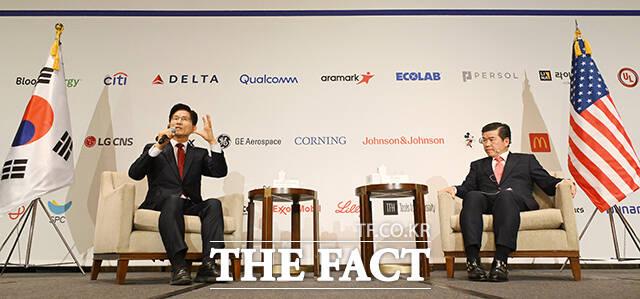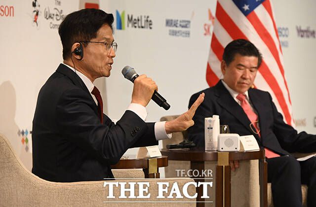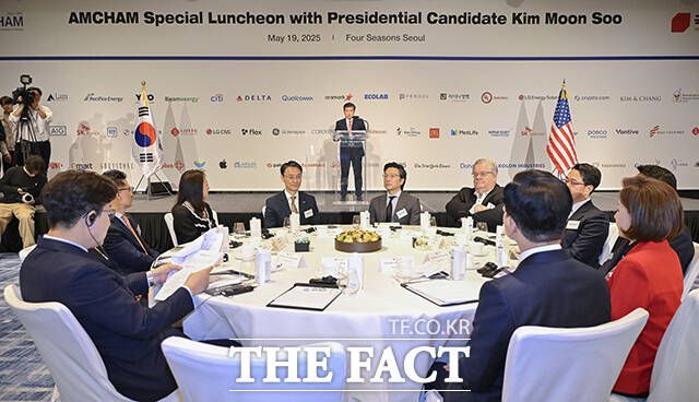 [더팩트ㅣ임영무 기자] 김문수 국민의힘 대선 후보(왼쪽)가 19일 서울 종로구 포시즌스호텔에서 열린 주한미국상공회의소(AMCHAM·암참) 초청 특별 오찬 간담회에 참석해 제임스 김 암참 회장과 대담하고 있다.