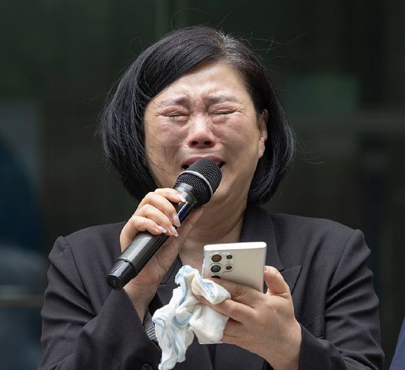 19일 서울 중구 서울고용노동청 앞에서 열린 MBC 기상캐스터였던 고(故) 오요안나 씨 특별감독결과 규탄 기자회견에서 오 씨의 어머니 장연미 씨가 발언하다 오열하고 있다. [사진=연합뉴스]