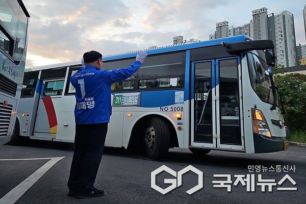 이광희 총괄선대위원장은 청주시 용암동에 위치한 시내버스 회사를 찾아 버스기사들에게 안전 운전을 기원하고 이재명 대통령 후보의 지지를 호소하고 있다.(제공=더불어민주당 충북도당) |