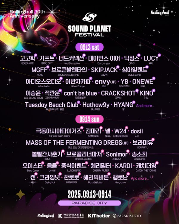 [스포츠투데이 윤혜영 기자] 음악의 성지 롤링홀이 개관 30주년을 기념해 개최하는 ‘사운드플래닛페스티벌2025 (SOUND PLANET FESTIVAL 2025)’가 총 32팀의 2차 라인업을 공개했다.