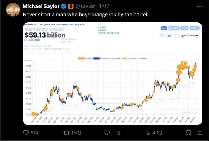 마이클 세일러는 과거에도 이와 같은 X 게시글을 올린 후 실제 비트코인 매수를 발표한 바 있다.