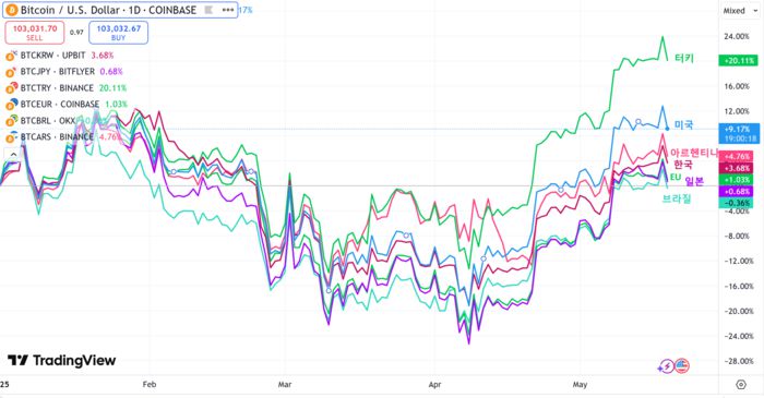 트레이딩뷰에 따르면 이날 오후 2시 기준 한국 코인시장에서 비트코인의 올해 상승률은 3.68%로 미국 시장에서의 상승률은 9.17%에 비해 40% 수준밖에 안되는 것으로 나타났다.