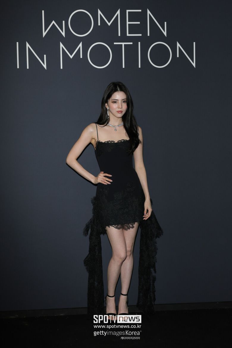 가느다란 어깨 스트랩이 달린 검정 레이스 디테일의 미니 드레스를 선택한 한소희는 각선미와 함께 위풍당당한 존재감을 드러내며 시선을 집중시켰다.