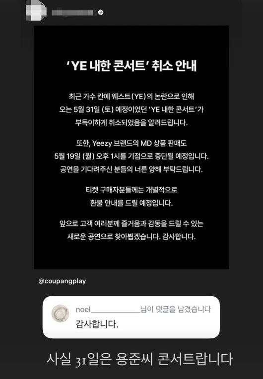 19일 노엘은 자신의 SNS를 통해 칸예 웨스트 내한 콘서트 취소 소식을 공유하며 "감사합니다"라는 멘트를 덧붙였다.