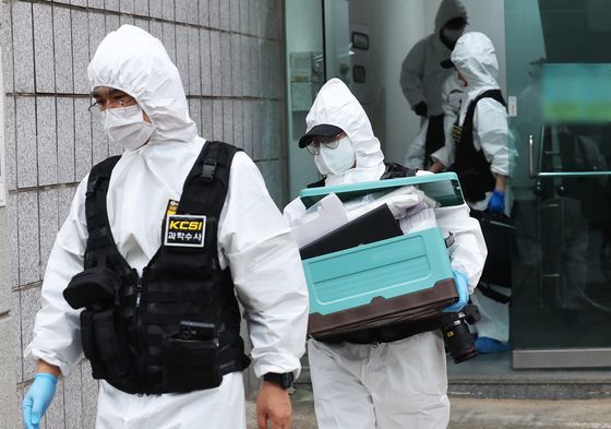 19일 경기 시흥의 편의점과 체육공원 등에서 50대 중국동포가 시민 2명을 잇달아 흉기로 찌르는 사건이 발생해 경찰이 수사에 나선 가운데 용의자의 자택과 그 주변에서 시신 2구가 발견됐다.   사진은 편의점 인근 건물에서 과학수사대원들이 감식을 마치고 나오는 모습. 연합뉴스