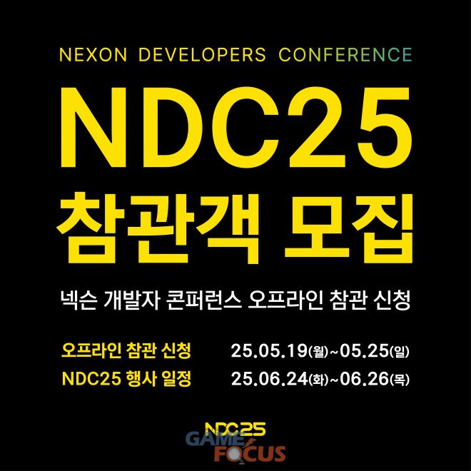NDC 25는 6월 24일부터 26일까지 3일간 경기도 판교 넥슨 사옥 및 일대에서 오프라인 공개 행사로 열리며, 게임업계 종사자는 물론 일반인, 대학생 등 게임 산업에 관심 있는 누구나 참관 신청이 가능하다. 신청은 NDC 공식 홈페이지(https://ndc.nexon.com/offline)를 통해 5월 19일부터 5월 25일까지 선착순으로 진행된다.