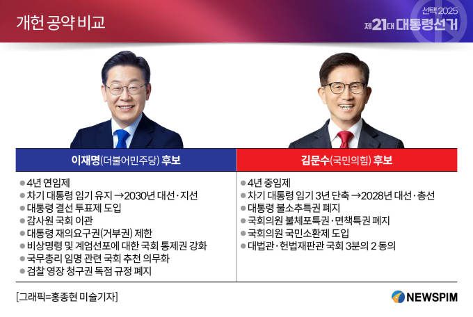 [서울=뉴스핌] 박서영 기자 = 이재명 더불어민주당 대통령 후보와 김문수 국민의힘 대통령 후보가 현행 대통령 5년 단임제를 손보자는 공약을 동시에 내놓으면서 '개헌론'에 다시금 불이 붙었다. 87체제를 넘어서야 한다는 큰 틀에선 공감대를 이뤘지만, 개헌의 방식이나 시기를 두고 후보 간 차이를 보이고 있어 양당 합의를 도출할 수 있을지는 미지수다.