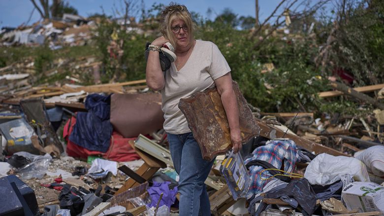 ▲ 한 여성이 토네이도 피해를 입은 집의 잔해 속에 서있다.