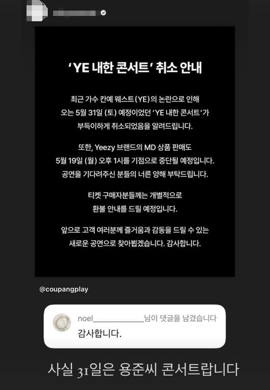 19일 노엘은 자신의 SNS(소셜미디어) 계정에 웨스트 내한 콘서트 취소 소식을 공유하며 "감사합니다"라고 적었다.
