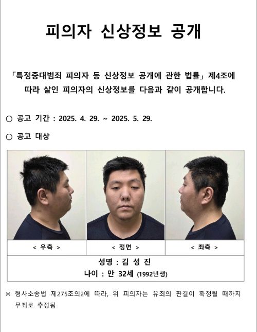 한편 경찰은 지난달 29일 신상정보공개심의위원회(위원회)를 열고 "범행의 잔인성·중대성이 인정되고, 범행의 증거가 충분하며, 범죄 예방 등 공공의 이익을 위해 신상정보가 필요하다고 판단했다"며 김성진의 신상정보를 공개했다.