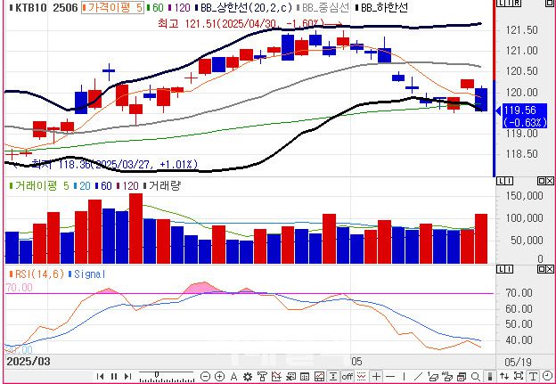 외국인이 이날 10년 국채선물을 순매수에서 순매도로 전환했다. 이에 차트상 10년 국채선물 가격도 재차 볼린저밴드 하단선을 하회하며 마감했다.