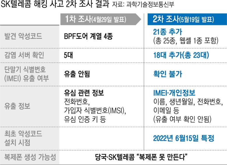 SK텔레콤 침해사고 민관합동조사단은 19일 현재까지 서버 23대가 악성코드에 감염됐고, 악성코드 25종을 발견해 조치했다는 내용의 2차 조사 결과를 발표했다. 지난달 29일 1차 조사 때엔 감염 서버 5대, 악성코드 4종이 확인됐는데 이번에 각각 18대, 21종이 추가됐다.