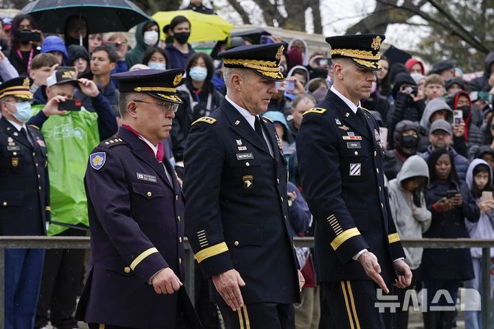 [버지니아=AP/뉴시스]중국군 무인기(드론)의 일본 주변 태평양 비행이 올해 들어 급증하고 있다고 19일 산케이신문이 일본 통합막료감부(한국 합동참모 격) 집계를 인용해 보도했다. 사진은 요시다 요시히데(가장 왼쪽) 일본 통합막료장(합참의장 격)이 제임스 맥콘빌(왼쪽) 당시 미국 육군 참모총장 등과 함께 미국 버지니아주 알링턴 국립묘지 무명용사 묘역에서 헌화식에 참석한 모습. 2025.05.19. |