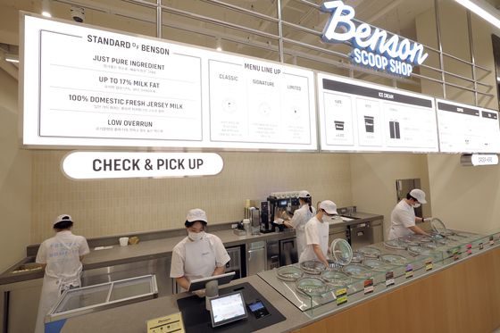 19일 서울 강남구 신사동 프리미엄 아이스크림 브랜드 '벤슨'의 플래그십 스토어 1호점 '벤슨 크리머리 서울' 1층 스쿱샵에서 직원들이 오픈 준비를 하고 있다. 뉴스1 |