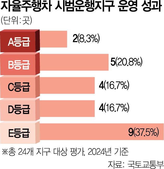 국토교통부에 따르면 시범운행지구 지정 이후 1년을 경과한 34곳 중 자율주행 서비스를 운영하지 않는 지구는 14곳으로 전체의 41.2%에 달한다. 자율주행 인프라 조성 차원에서 2020년부터 시범운행지구는 매년 늘었지만 자율주행 사업자 유치, 예산 부족 등 문제로 무용지물로 전락한 것이다. 정부 관계자는 “각 지자체에서 의욕적으로 시범운행지구 운영 계획을 세우고 시작했지만 관련 사업자의 부재나 예산 문제로 진행조차 안 되기도 한다”고 설명했다. 실제 국토부가 지난해 시범운행지구 24곳을 대상으로 운영 성과를 평가한 결과 절반이 넘는 13곳이 낙제점인 D·E등급을 받았다.