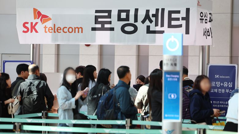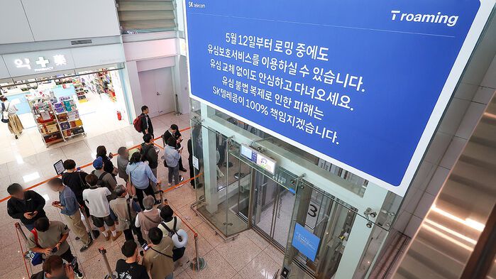 ▲ 지난 4일 인천국제공항 제1여객터미널 출국장에 마련된 SK텔레콤 로밍센터에서 출국자들이 유심 교체를 위해 줄을 서고 있다.