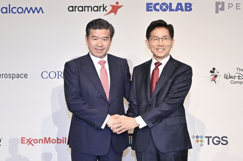 김문수 국민의힘 대선 후보(오른쪽)와 제임스 김 주한미국상공회의소(암참) 회장이 19일 서울 종로구 포시즌스호텔에서 열린 암참 간담회에서 기념촬영을 하고 있다. /송의주 기자 songuijoo@ |