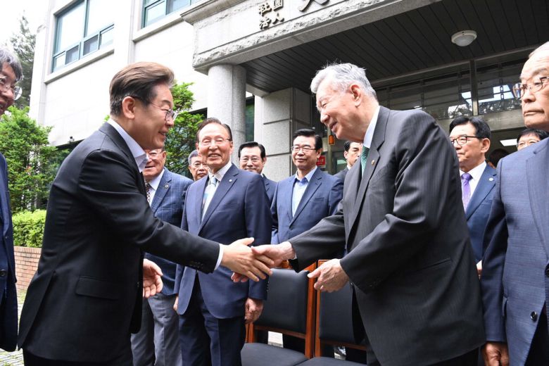 이재명 더불어민주당 후보가 19일 대한노인회중앙회를 찾아 이중근 대한노인회장과 악수하고 있다. 김호영 기자 |