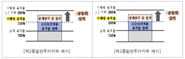 건축허가·신고 대상이 지구단위계획구역에 해당하면 기존 계획을 일괄 재정비 후 용적률 완화가 적용이 가능하고, 제2·3종일반주거지역 허용 용적률에서 50%를 추가로 적용할 수 있도록 할 계획이다.