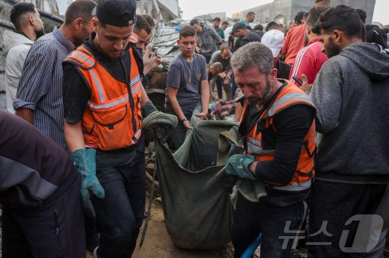 팔레스타인 구조대가 18일(현지시간) 가자지구 북부 자발리아의 알 사프타위 지역에서 이스라엘 공습으로 숨진 이의 시신을 수습하고 있다. 2025.05.18. ⓒ AFP=뉴스1 ⓒ News1 이지예 객원기자