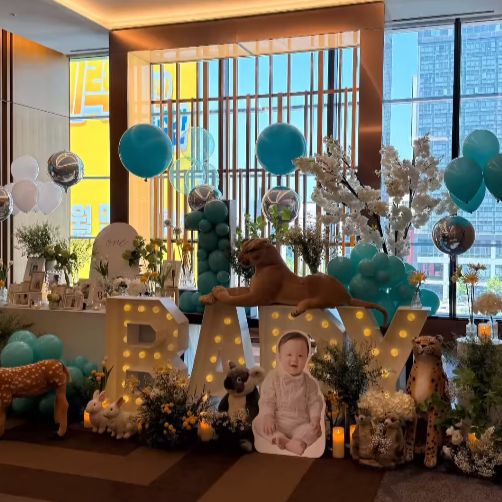 이날 공개된 사진에는 우인 군의 등신대와 'BABY'라고 적힌 조명, 그리고 다양한 동물들과 하늘색 풍선으로 화려하게 꾸며진 돌잔치 현장이 담겨 있으며, 특히 돌잔치에는 삼촌인 배우 하정우가 함께해 더욱 이목을 집중시켰다.