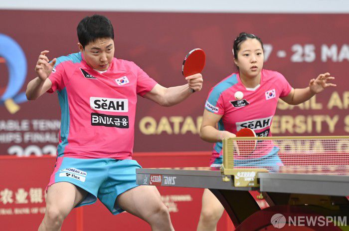 [도하=뉴스핌] 사진공동취재단 = 임종훈, 신유빈이 19일 카타르 도하 카타르대학교 스포츠 컴플렉스에서 열린 2025 국제탁구연맹(ITTF) 세계선수권대회 혼합복식 32강에서 나이지리아 올라지데 오모타요-카비라트 아요올라 조와 경기를 펼치고 있다. 2025.05.19 photo@newspim.com