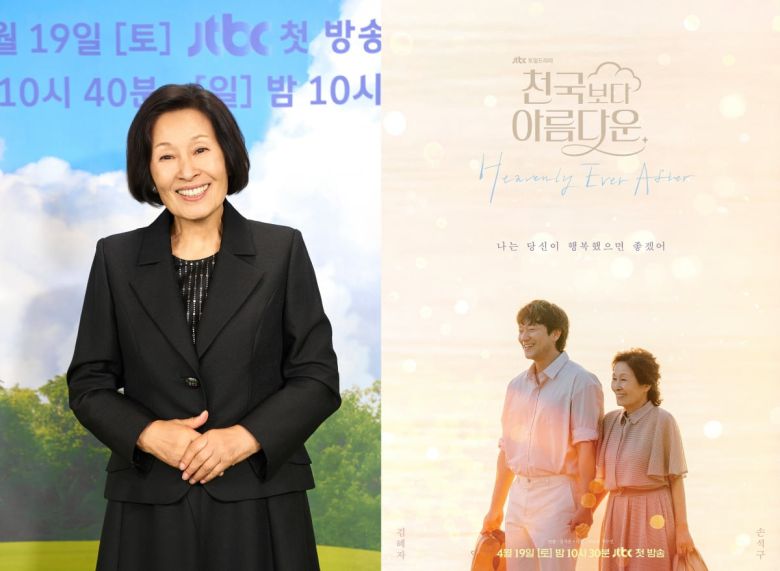 '천국보다 아름다운'은 80세 모습으로 천국에 도착한 이해숙(김혜자 분)이 30대 모습으로 젊어진 남편 고낙준(손석구 분)과 재회하면서 벌어지는 현생 초월 로맨스 드라마다. 6년 전 방송 됐던 '눈이 부시게' 작감배(작가·감독·배우)가 재회한 작품으로 관심을 모았다.