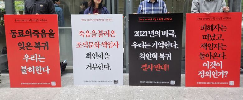 오세윤 네이버노조 지회장은 이날 시위에서 “최인혁 전 최고운영책임자의 복귀는 네이버를 더 건강하게 만들기 위한 많은 이들의 지난 4년간 노력을 헛수고로 만드는 결정”이라며 “가장 큰 책임이 있는 자가 아무렇지 않게 복귀하는 것은 구성원 수천의 신뢰를 저버리는 행위”라고 비판했다.