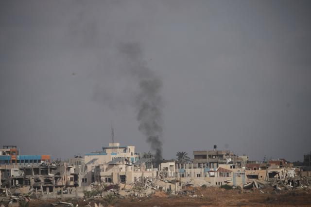 가자지구 칸유니스에서 19일 이스라엘군의 공습으로 연기가 피어오르고 있다. 이스라엘군은 19일 가자지구에서 2번째로 큰 도시 칸유니스와 인근 마을 주민들에게 또다시 대피령을 내렸다. 칸유니스(가자지구)=AP/뉴시스