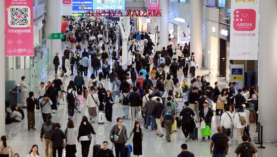 5월 황금연휴를 시작한 지난 1일 근로자의 날을 맞아 해외여행을 가기 위한 여행객으로 인천국제공항 제1여객터미널이 붐비고 있다. [뉴스1] |
