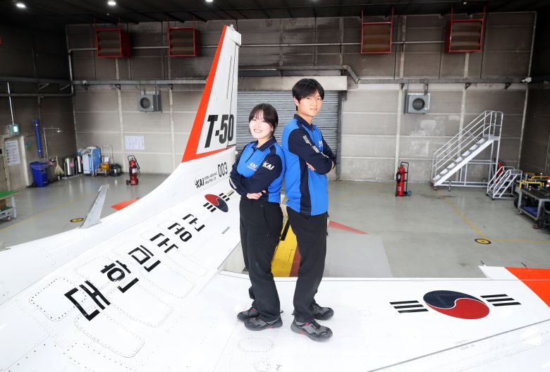 경남 사천시 한국항공우주산업(KAI) 정규직 채용돼 근무하는 청년 2인. (오른쪽부터) 이수안 (20),박경훈(21)씨가 초음속 고등훈련기 T-50 격납고에서 포즈를 취했다./김동환 기자