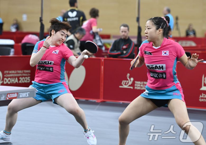 신유빈(오른쪽), 유한나가 19일 카타르 도하 카타르대학교 스포츠 컴플렉스에서 열린 2025 국제탁구연맹(ITTF) 세계선수권대회 여자복식 32강 조르지나 포타(헝가리), 드 누트(룩셈부르크) 조와 경기를 펼치고 있다. (사진공동취재단) 2025.5.19/뉴스1 |