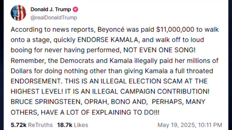트럼프 대통령은 SNS에 올린 글에서 대선 때 해리스 전 부통령을 지지하고 최근 해외 공연에서 자신의 비판한 가수 브루스 스프링턴과 비욘세, U2의 보노, 방송인 오프라 윈프리 등을 거명하며 이같이 밝혔습니다.