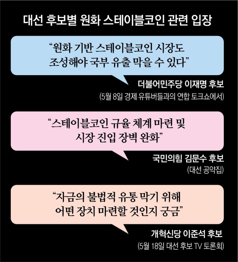 첫 TV 토론에서 더불어민주당 이재명 후보는 “원화 기반 스테이블코인을 만든다는 것은 담보로 그 액수 만큼 넣어 놓고 거기에 맞게 코인 발행을 허용한 것이어서 안정성이 있다”고 말했다. 이에 대해 개혁신당 이준석 후보는 “(원화 가치와 일대일로 연동되는 코인에 대한 준비금 보유가) 동작 가능한지 궁금하고, 자금의 불법적인 유통을 막기 위해 어떤 장치를 할 것인지도 궁금하다”고 지적했다. 이 후보는 대표적인 달러 기반 스테이블코인인 테더(USDT)와 서클(USDC)의 차이를 아는지 질문하며 서클이 “계좌 동결을 할 수 있어 관리가 엄격하다”고 주장하기도 했다. 국민의힘 김문수 후보는 공약에 가상자산 활성화를 위해 스테이블코인 규율 체계를 마련하겠다는 계획을 포함시켰다.