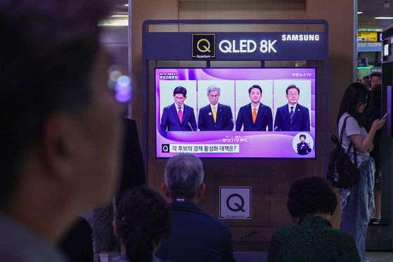 18일 서울역 대합실에서 시민들이 제21대 대선 1차 후보자 토론회 중계방송을 지켜보고 있다. 연합뉴스